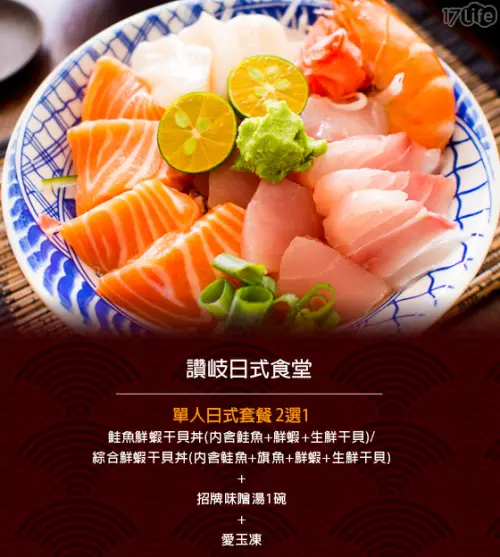 (內含鮭魚+旗魚+鮮蝦+生鮮干貝)2選1+愛玉凍+招牌味噌湯1碗(轉自團購網)