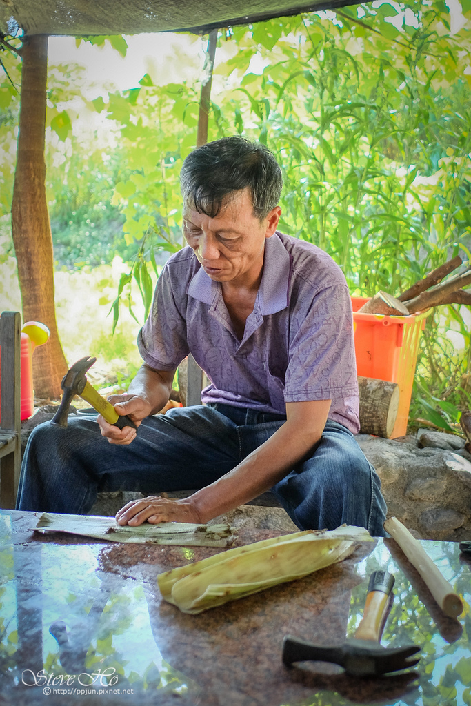 ▲ 製造流程如下:砍代構樹→截取樹幹→切割樹皮→樹皮與樹幹分離→敲打樹皮→過水→燙平