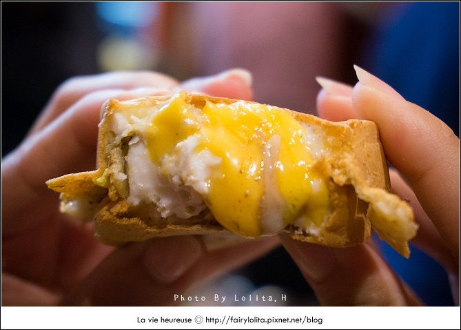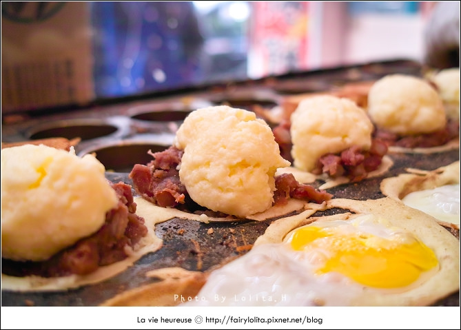 煎得幾乎全熟的蛋黃,再加上整片的起士,一咬下去,滿溢的起士就噗滋滋流出來了,先不說馥郁香濃的起士,連胡椒粉也很強大,不曉得去哪生來這胡椒,如果說單單吃起士加蛋有90分的話,那麼加了胡椒就是超過100分的美味,而且連它的餅皮也超酥厚香的呦!太銷魂、太正點!可以說我到現在吃過最好吃的鹹式車輪餅囉!