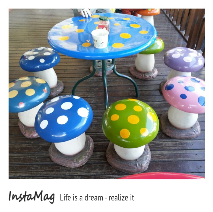 我們坐的桌椅是彩色的香菇造型耶,真有意思