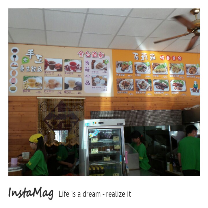 外面主要是櫃台及用餐區,既然來到了香菇的故鄉,當然要來吃看看這裡的美味小吃囉,菜單主要有香菇肉燥飯/鹽酥杏鮑菇/杏鮑香腸/鹽酥綜合菇/香菇丸湯/百菇羹,及養生飲品,另外還有賣全台首創的香菇冰品喔,冰有兩種,一種是香菇冰淇淋杯裝的(香菇,牛奶,糖和鹽),另一種是香菇冰棒,香菇味道濃厚,都是來百菇莊必買的新社限定冰品喔