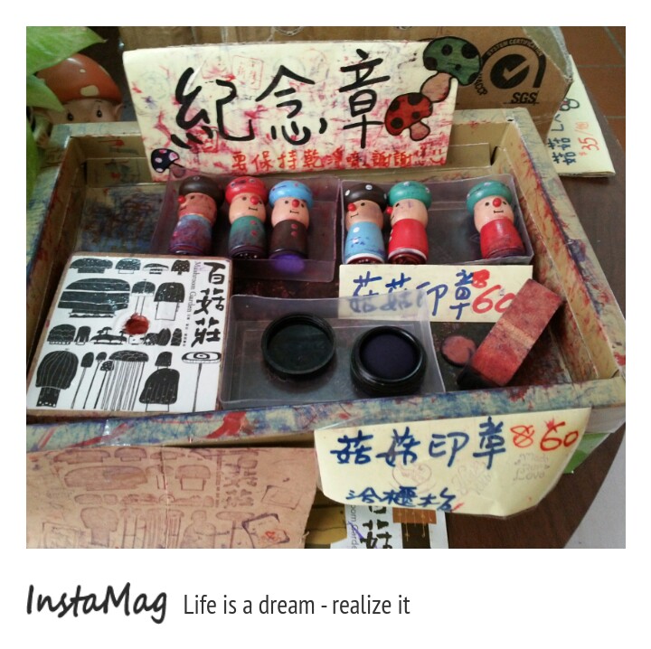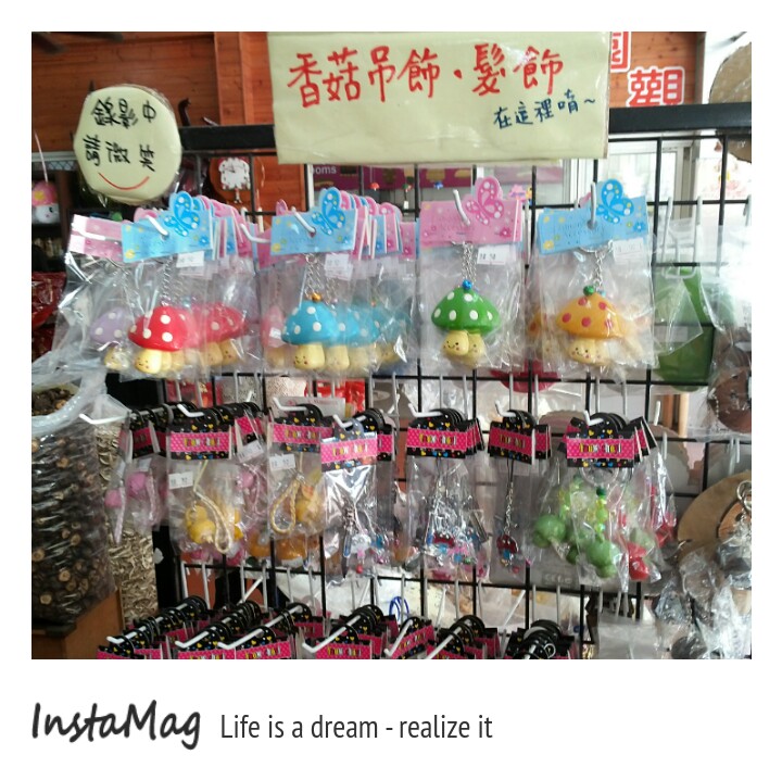 賣場裡各式種類的菇,還有香菇餅乾,肉乾,罐頭,乾貨,角落還有小朋友愛的香菇小娃娃及可愛文具和髮飾品,姑姑印章好卡哇意內
