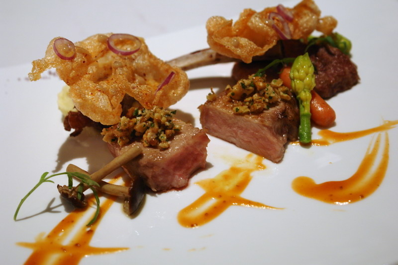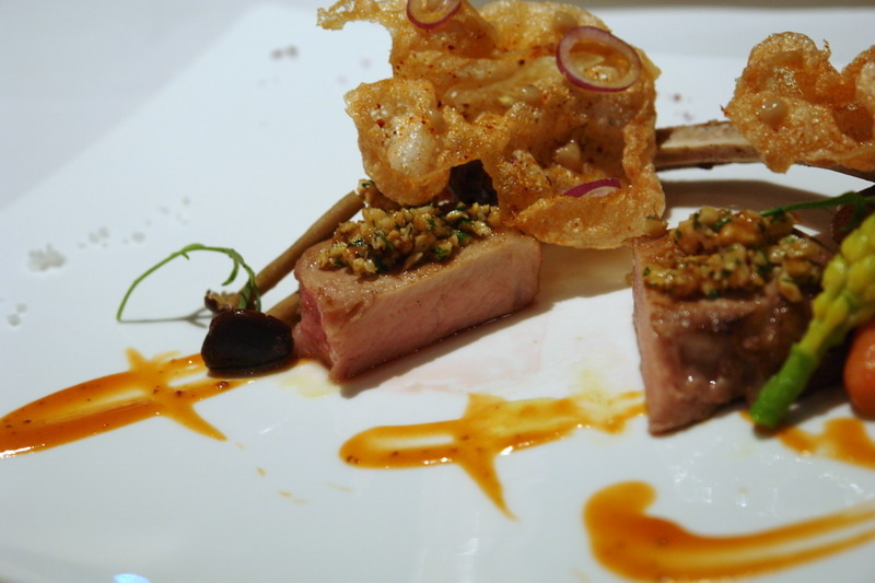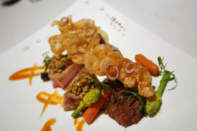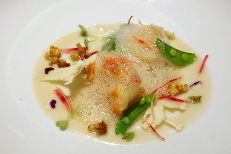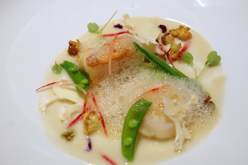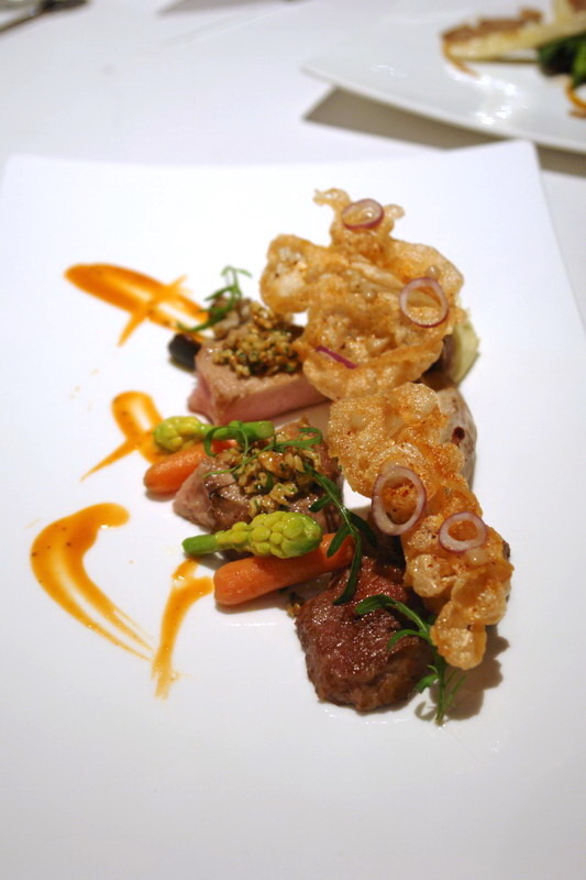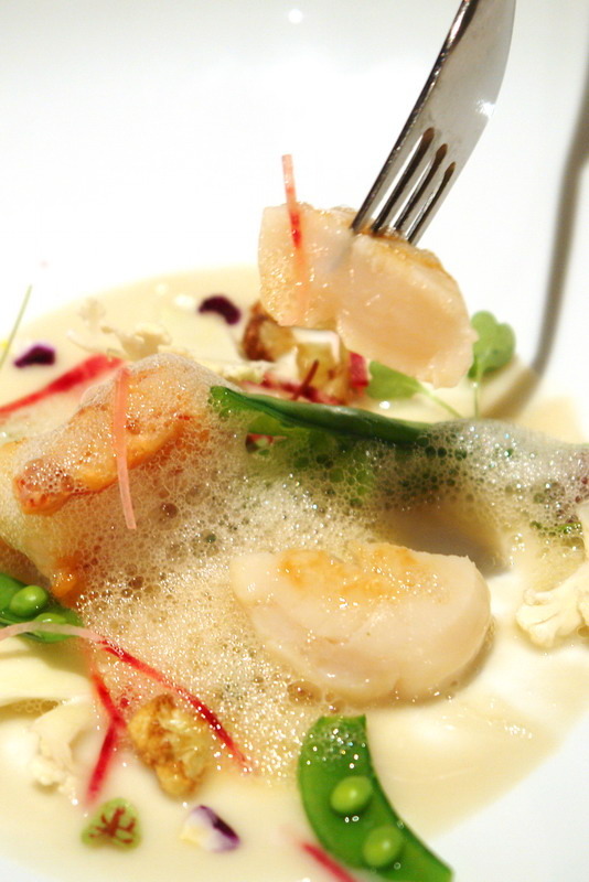 新鮮干貝和大蝦,簡單煎烤,保留本身的甜味,厎下是濃郁的白花椰菜泥,整套餐點的延序,非常得宜,到這個時候,就像是一段海洋的遊歷,像是從太平洋經印度洋到大西洋,再回到太平洋般的不同享受。