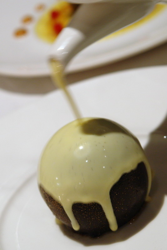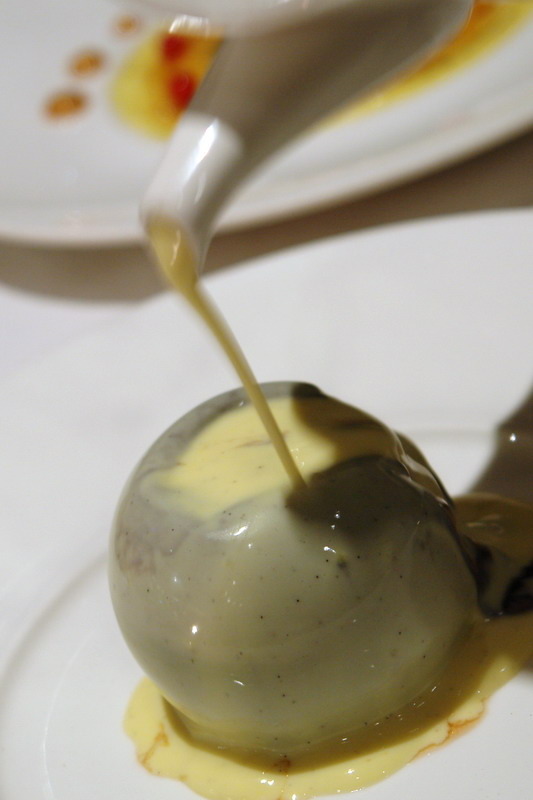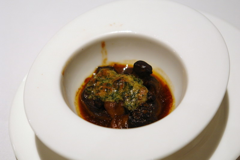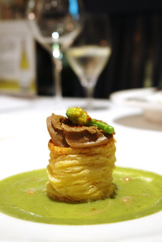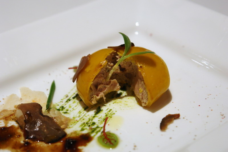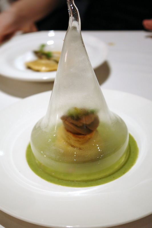 用煎焦香的鴨肝,做為內餡,下是南瓜泥,上是蕪菁汁,中間是松露還有鴨肝,真是把法式料理的元素,重新組合了。有依舊的記憶又有重新的組合。