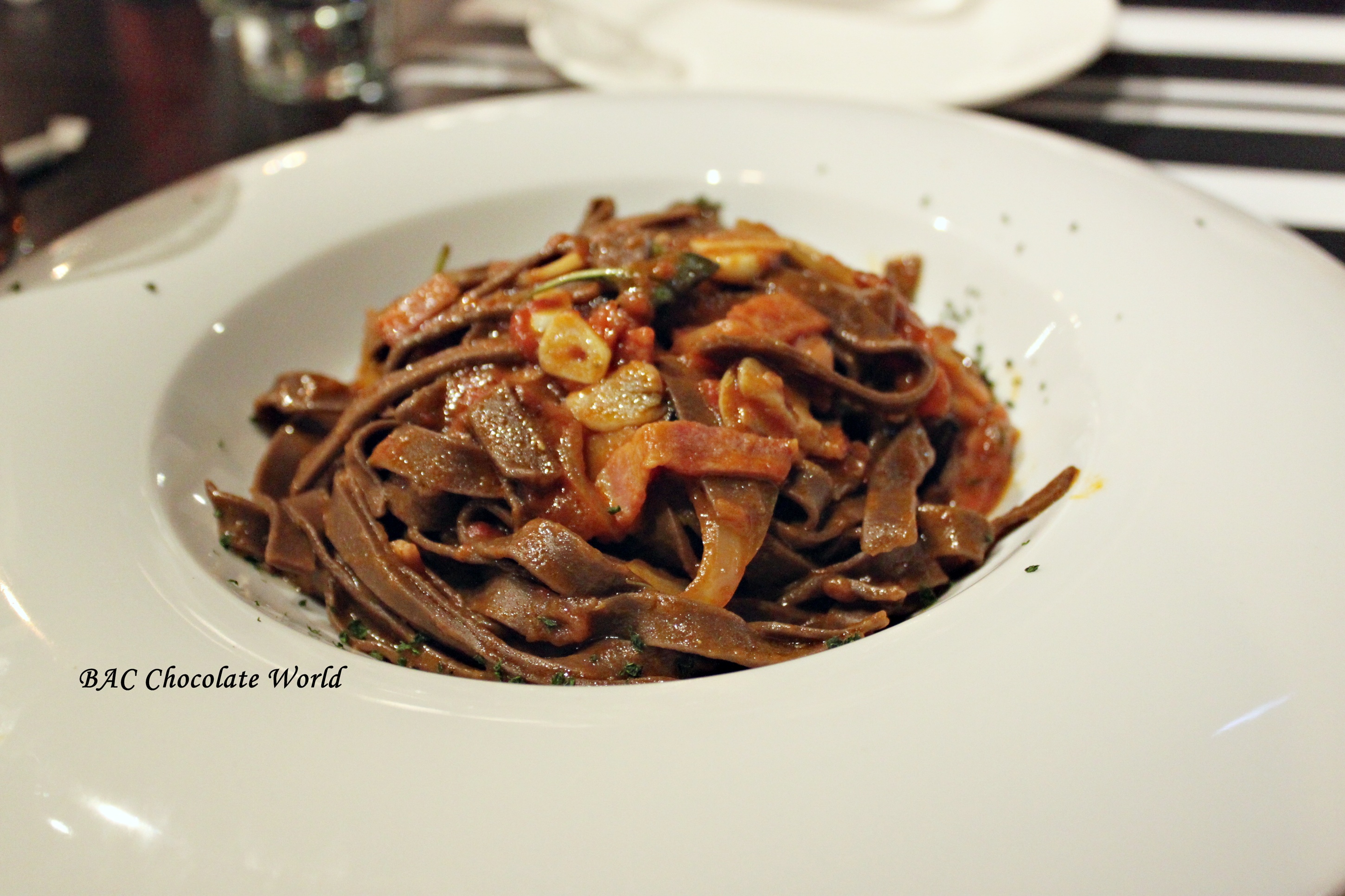 阿馬托利那風味寬麵 這些麵條都是可可粉去製作出來 很特別 顏色就是很深的咖啡色 吃起來其實沒有什麼味道 也滿有勁道的 屬清淡口味