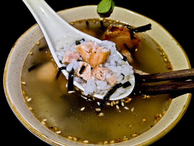 鮭魚烤到略乾, 香氣十足, 趁還沒被湯完全弄軟就弄碎搭配飯吃, 好吃