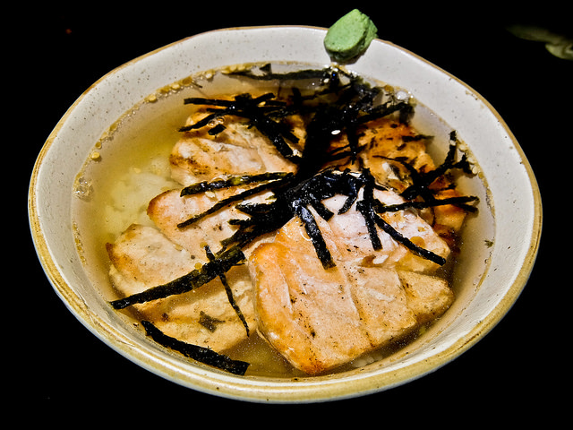 一般鮭魚茶泡飯都是烤好的鮭魚碎肉拿來泡, 比較特別的像已歇業的三大日味屋是拿生鮭魚用湯燙到半熟