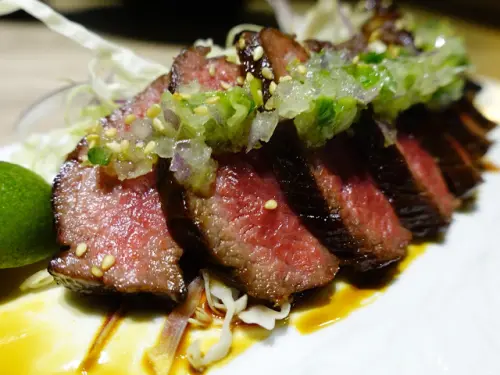 生牛肉外層有些許炙燒過的色澤,吃起來一點腥味都沒有