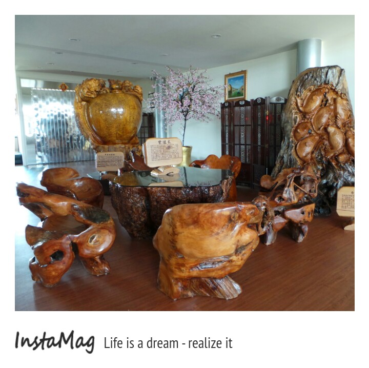 這裡有大型的原木桌椅可提供休息,以及特殊原木造景可欣賞