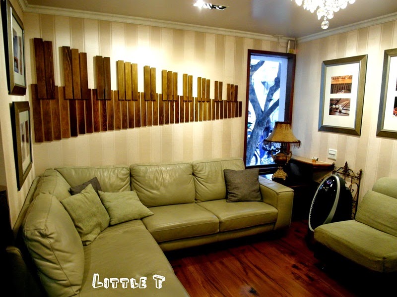 一進門就看到的木質地板和淺色系沙發,讓客人在候位時也能坐的舒服,牆上則是用木琴的造型來裝飾