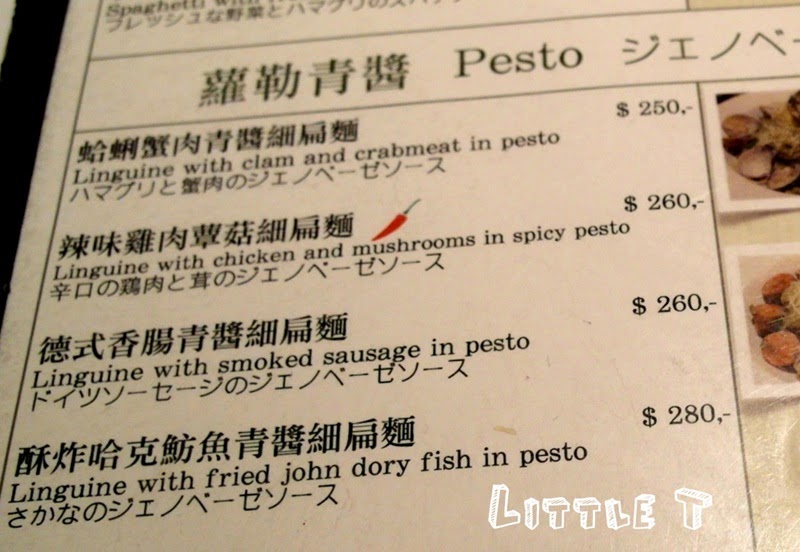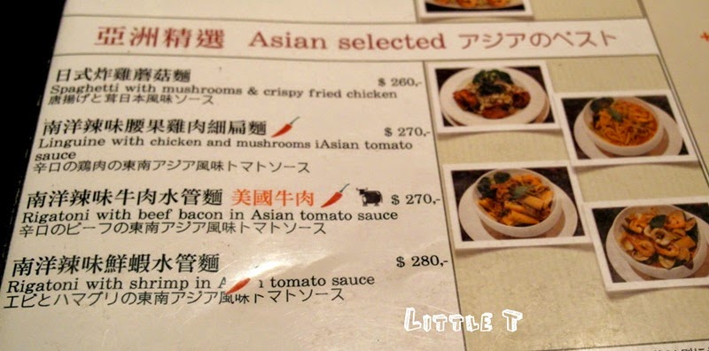義大利麵有茄汁紅醬、羅勒青醬、奶油白醬、清炒類、燉飯、排餐可供選擇,比較特別的是還有提供南洋風味的義大利麵