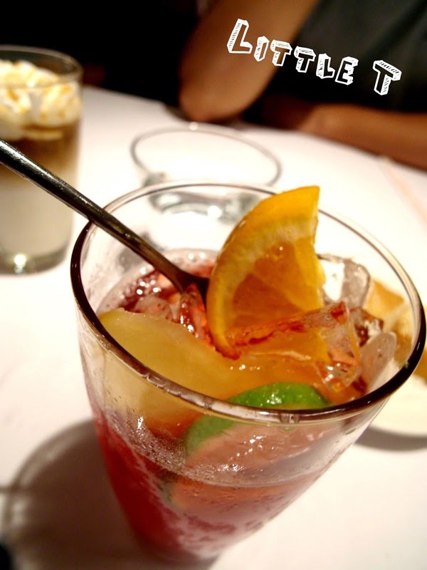 水果茶裡面的料有柳橙、蘋果、檸檬,乍看之下覺得是杯沒什麼料的水果茶....一喝後不得了!! 原來裡面是以酸酸甜甜的莓果當作基底調配,所以才會呈現紅色的~好喝好喝~