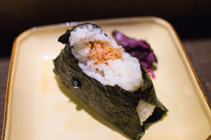 看吧台的師傅現捏飯糰好像挺好吃的,於是最後加點了一份鮭魚飯糰,微熱的飯糰外頭包了層海苔。