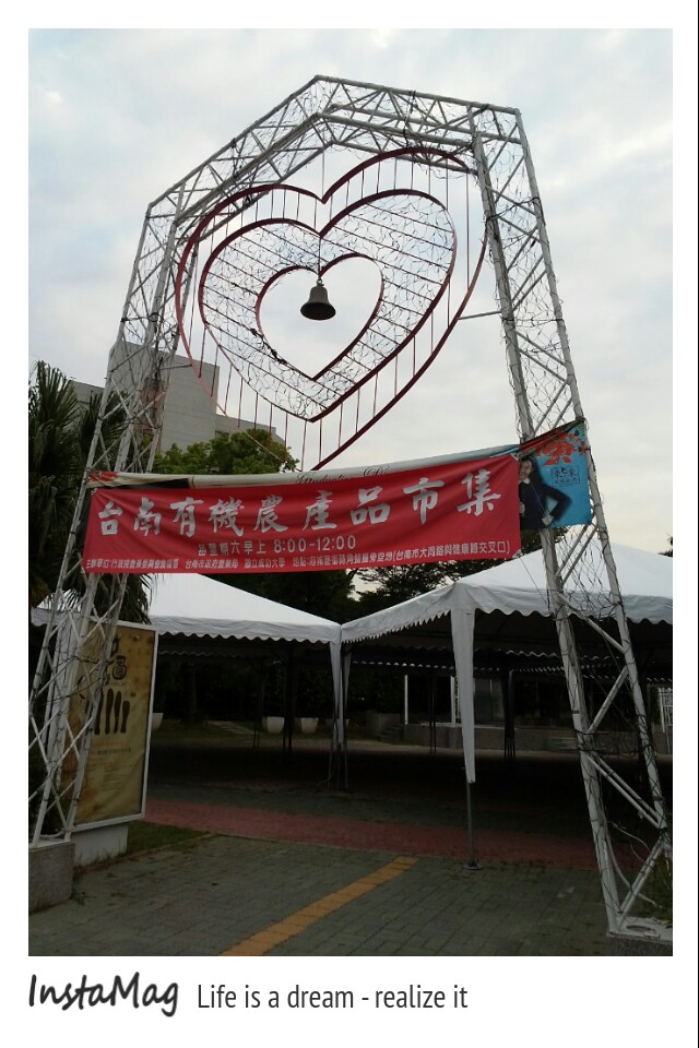 設置的白色拱門上掛了紅通通的愛心,打造浪漫的愛情花園步道