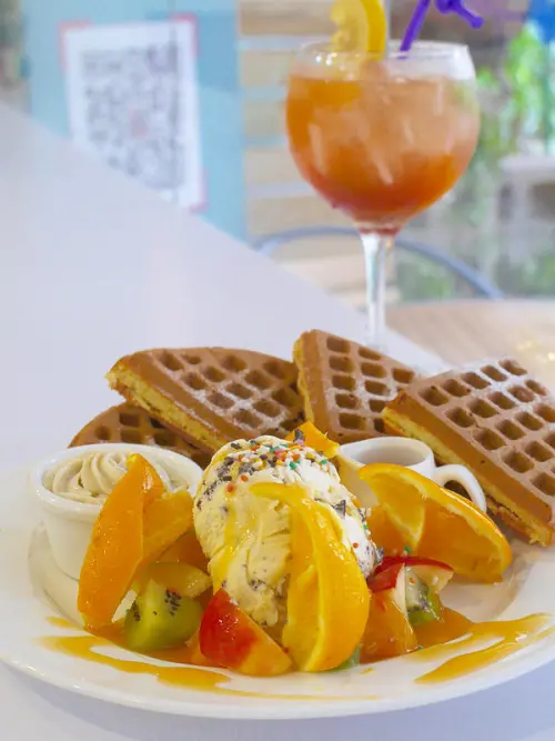 焦糖法式吐司佐手工果醬(220元),用奶油蛋煎香的厚片吐司,再撒上糖粉,淋上酸酸甜甜的果醬,麵包吃起來軟嫩中帶有焦糖香,吐司邊邊帶有點酥酥的糖霜顆粒,加上在嘴裡爆開的小紅莓酸甜滋味,有姐妹投它第一名,但也有姐妹偏好吃沒淋醬汁的,這樣吐司口感會維持比較鬆綿,會建議店家可以把果醬另外裝盛,可以迎合多元的需求。