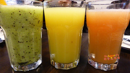 飲料登場~咱們三人各點了一杯新鮮現打的果汁,由左而右依序是奇異果汁、柳橙汁與葡萄柚汁
