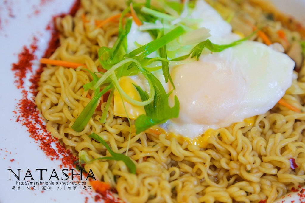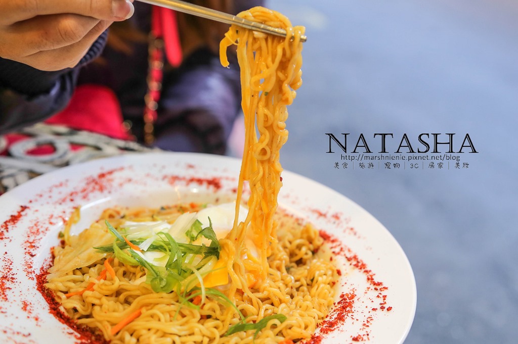他們的辛拉麵是使用乾式泡麵的方式呈現,而且辣度沒有像原先辛拉麵那麼辣,可說是針對台灣人口胃所做的改良式辛拉麵,