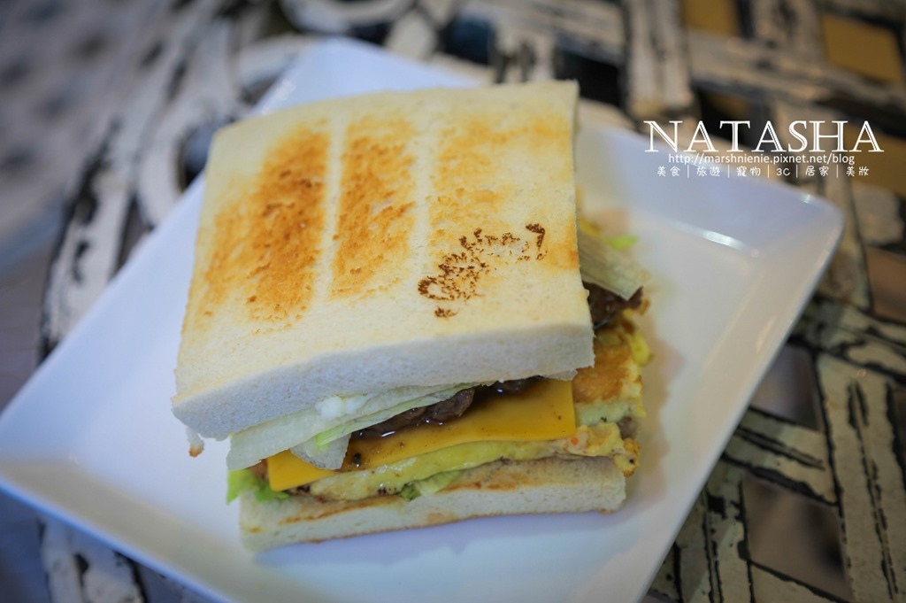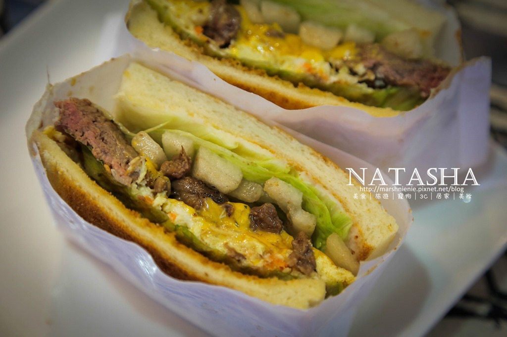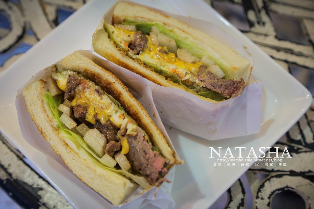 他們的土司有將吐司邊切除,中間夾的食材很多,除了有最主要的牛排外,還有薯泥、蔬菜蛋、安佳起司、美生菜、梨醬,