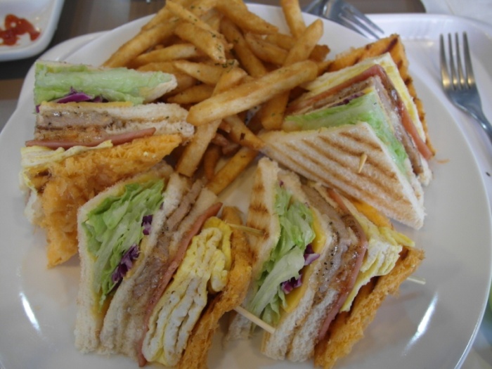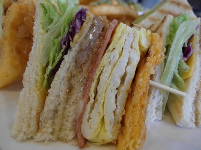 酥皮、炒蛋、火腿、豬肉、起司、生菜、吐司。