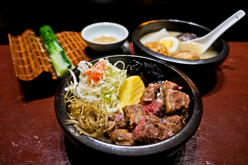 切成骰子型狀的牛肉烤的熟度正好, 調味本身已經微鹹, 搭配飯吃正好, 牛蒡絲切的很細易入口