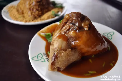 肉粽配上花生粉及店家特製醬油膏搭配得十分完美,粽葉的香氣完全深入其中,伴著一口花生粉及甜甜的醬油膏讓人捲進香味的漩渦中。