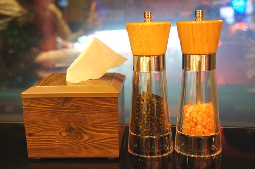 旁邊有黑胡椒和玫瑰鹽.