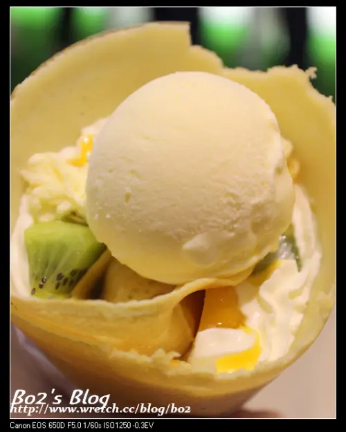 所謂可麗餅只是把餅皮捲成甜筒狀,裡面再塞入各色配料,重點他是脆