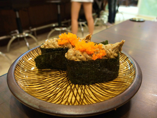 令人垂涎欲滴的蟹膏軍艦捲上桌了。