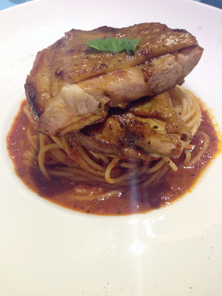 雞腿快滿嫩的喔!也滿大塊~~~基底的麵條是番茄肉醬口味的醬汁!!