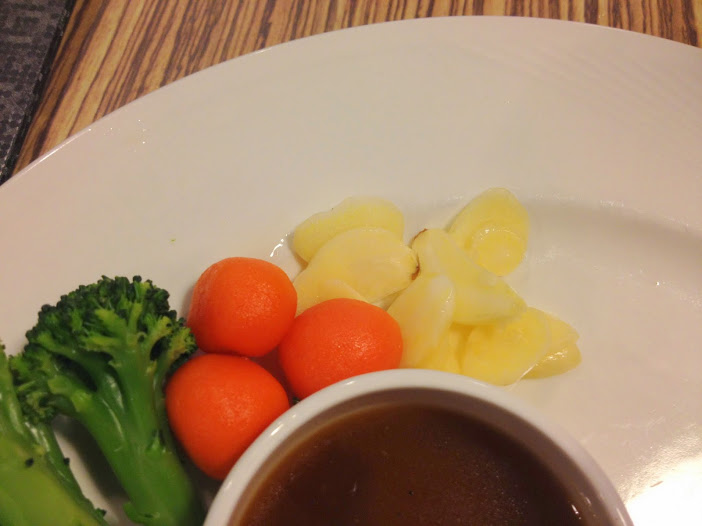 炭烤的壓紋很漂亮,一碗牛肉湯(沾醬),兩塊帶皮小薯加上一塊花野菜、小紅蘿蔔(醃製的櫻桃蘿蔔) 大蒜數片