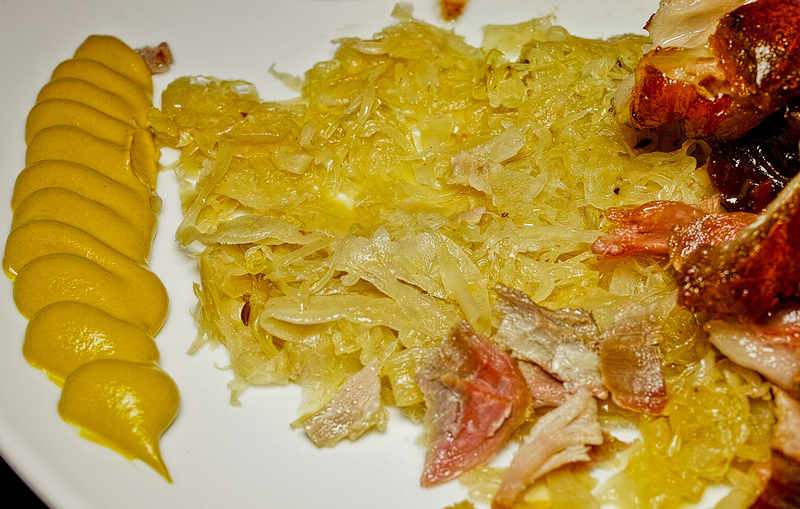 底下酸菜不錯, 由於豬腳小油, 搭配酸菜和黃芥末醬一起吃更佳