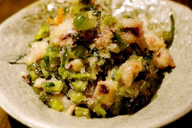 已經冰鎮過的章魚在加入一點海帶絲與山葵後