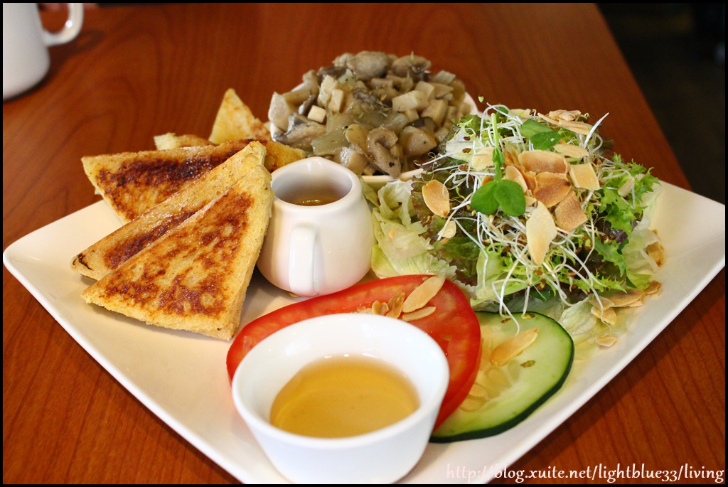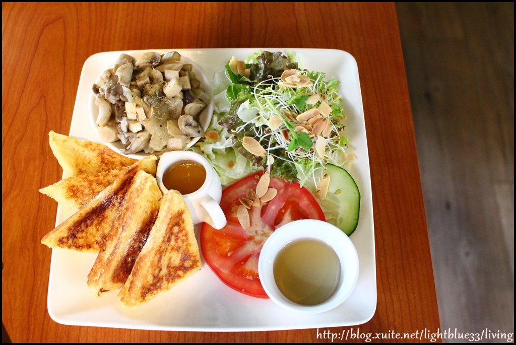 有法式土司、一盅炒菇、生菜、淋醬,