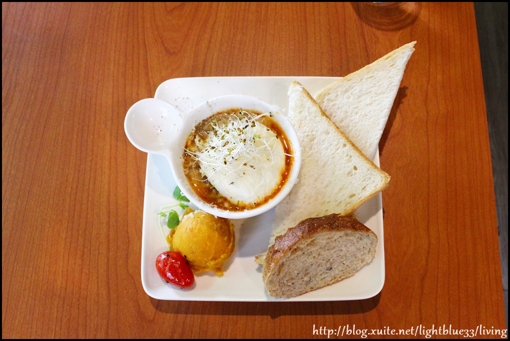 有一片土司對切、一小塊麵包、一球地瓜泥、一盅香料肉醬與水波蛋