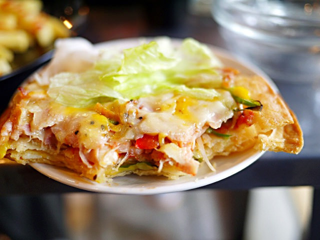 又不忘補充說"這個pizza好吃又很健康"(因為很多生菜XD)