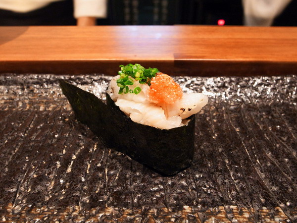 第三貫是鰭邊肉軍艦捲,使用比目魚鰭邊肉微炙過上頭一小撮明太子,