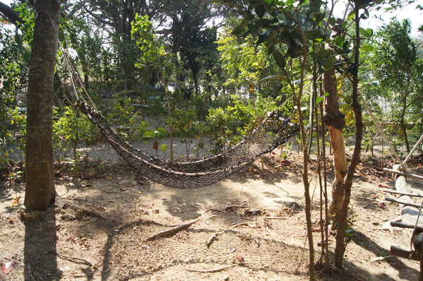 林館長利用巧思,使用廢棄物搭建盪鞦韆、吊床,讓孩子可以在最自然的叢林裡在樹上攀爬,樹下盪鞦韆與躺吊床賞蝶飛舞,聽海風與鳥叫蟲鳴。