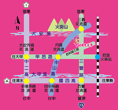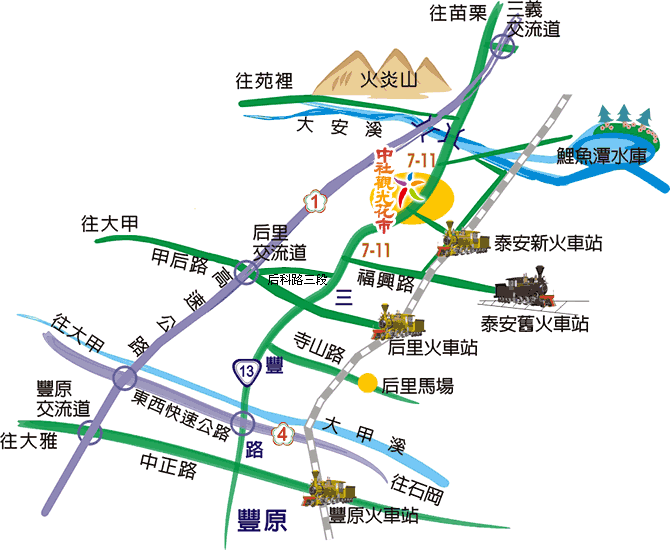 ![]() | ◎西部幹線「后里站」下車,再搭乘計程車至中社觀光花市。 ◎或「泰安站」下車,再往西步行約20分鐘即可到達。 | ||