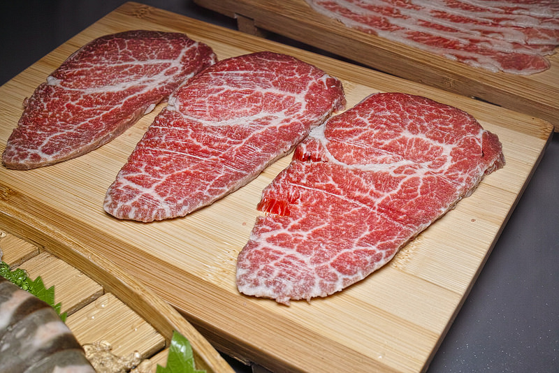 現場看到有人點就貪心也點了一份, 極黑牛的油花與澳洲和牛可說不相上下, 同時, 和牛就是要厚一點才有口感, 這肉切的夠厚