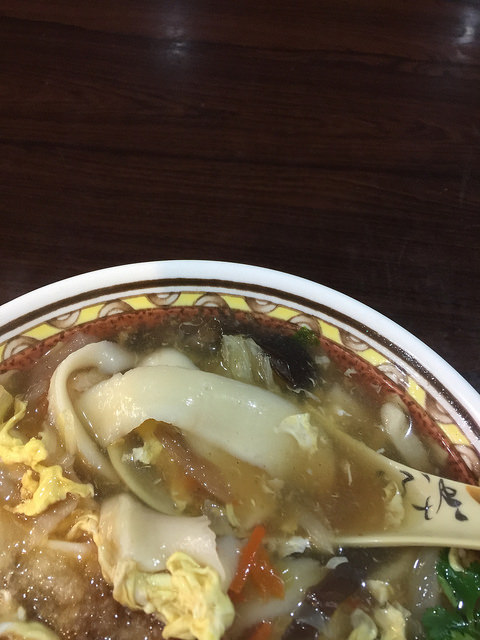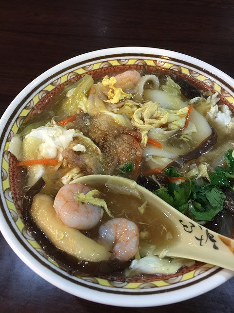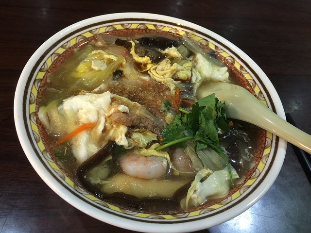 而大滷麵的配料 超多的 除了有蛋花 黑木耳 還有蝦仁 花枝 甜不辣