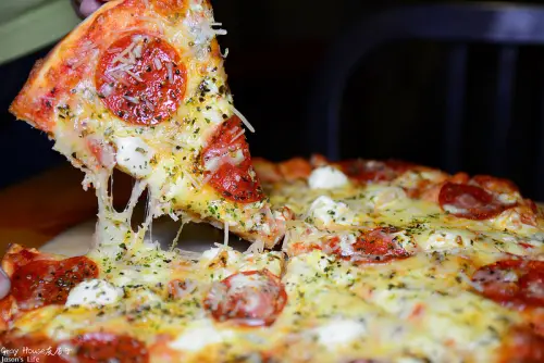 拿起披薩變成令人流口水的牽絲畫面,番茄香味有出來,加上甜鹹的起司味