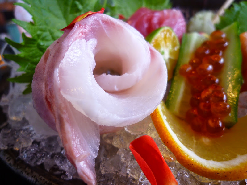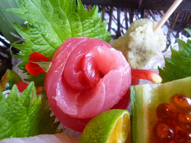 由鮭魚.鮪魚.鰤魚生魚片作成的玫瑰花,沾上現磨山葵加醬油