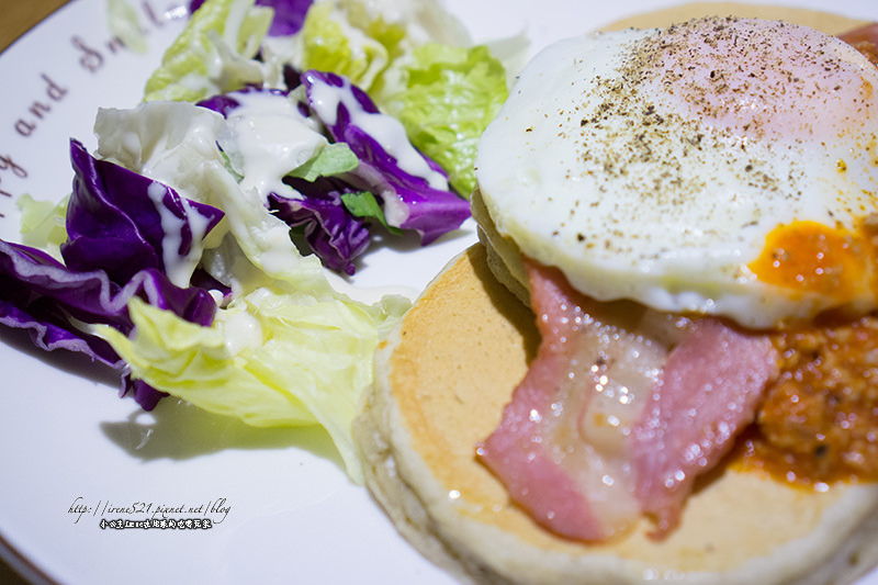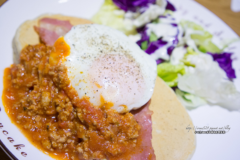 鬆餅、太陽蛋、培根、蕃茄微辣肉醬加上鮮蔬沙拉,