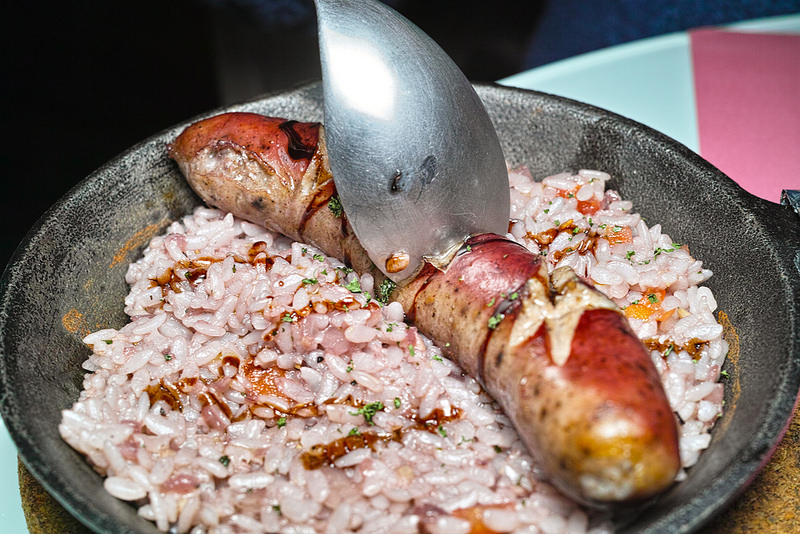 用鐵鍋盛著的香腸飯, 香腸又烤的很香, 一上來就讓人食指大動啊