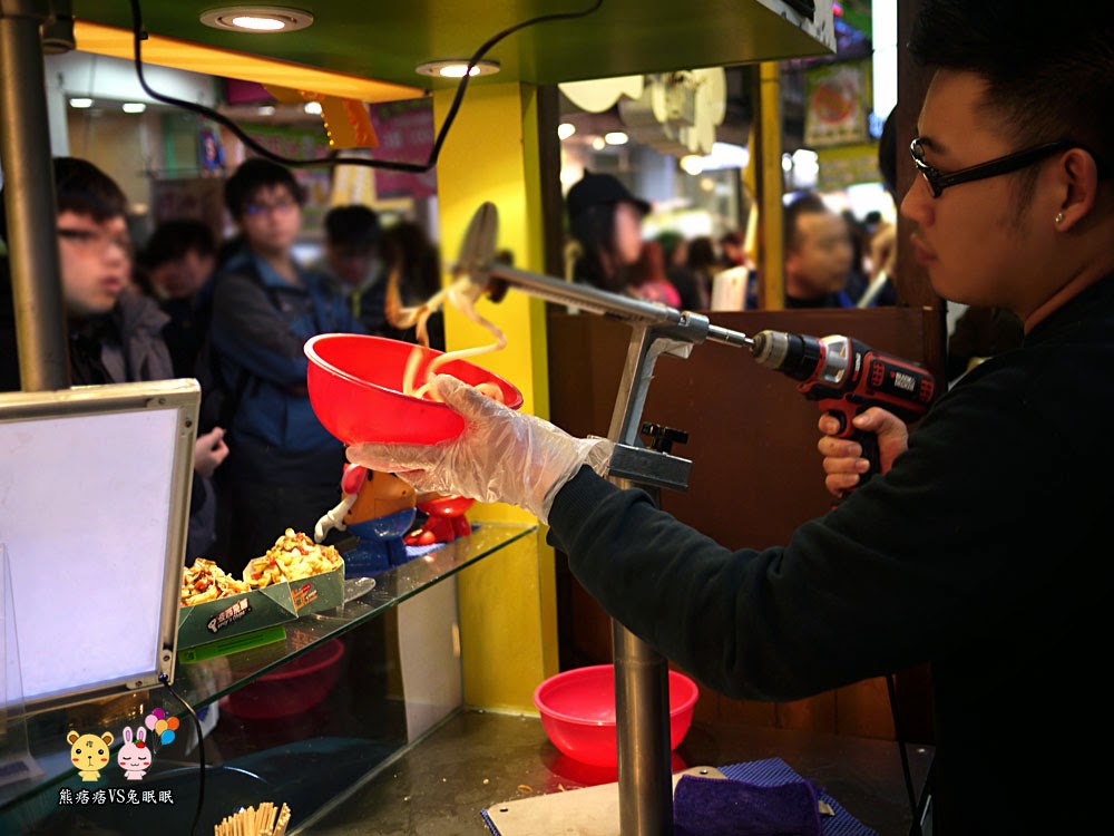 一開始對於他們的招牌很好奇,後來老闆解釋,原本操作的機台是用手慢慢轉的,不過這轉的速度可能要轉到百年後,客人都會等不急拉,所以後來經過加工處理,就把電鑽結合再一起,從此招牌就如上圖所看到的畫面。