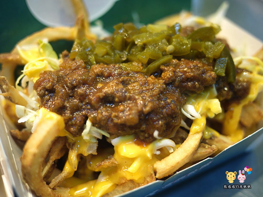 起司辣肉醬飛薯(牛肉肉醬),這一道要趁熱吃,冷了會因為醬汁的關係導致薯條變軟,建議不要放太久影響口感,上面淋上了起司,鋪上了肉醬、生菜絲與墨西哥辣椒,霸氣十足。