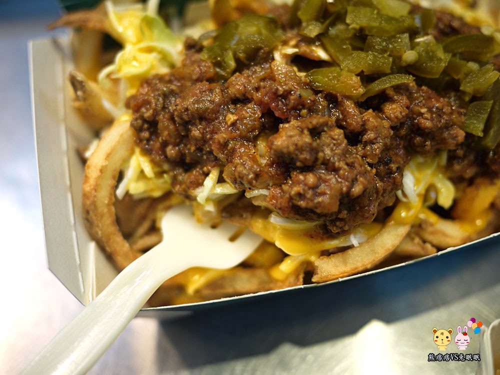 而且那時候老闆說他們家的醬料是淋上兩層的,一開始我不明白這句話的意思?直到把下面的薯條掀開後才發現,原來在第一層的薯條上就會先淋上一次醬料,避免客人吃到下面沒醬了,之後再鋪上另一層薯條與醬料等,雙層享受有夠邪惡的。