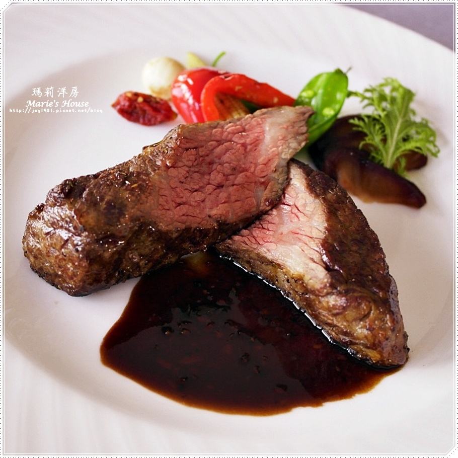 搭配的醬汁有陳年酒釀牛骨汁/紅酒醬汁/海鹽,