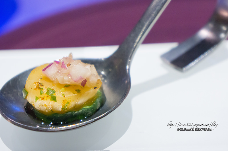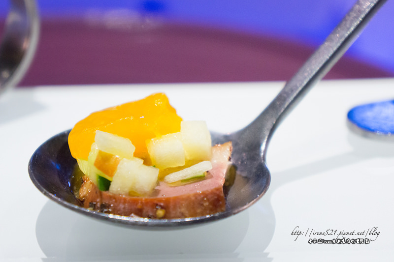 中間金黃圓球狀是芒果醬sauce,品嚐前先把球狀體搓破,讓醬汁流出來,