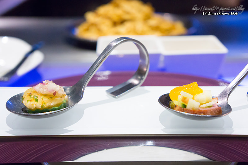 「和風鮮干貝」「香橙燻鴨胸」,建議由右至左品嚐,